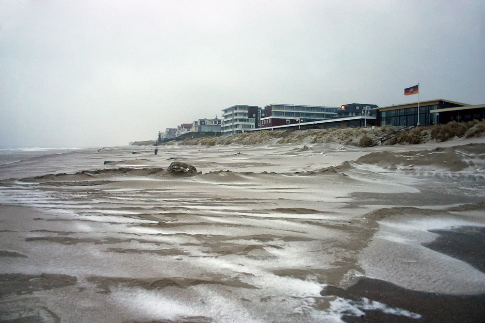 Kaltes Winterwetter am Wangerooger Hauptstrand. Daß hier im Hochsommer Menschen in Bikini oder Badehose herumlaufen, kann man sich anhand des Fotos kaum vorstellen.