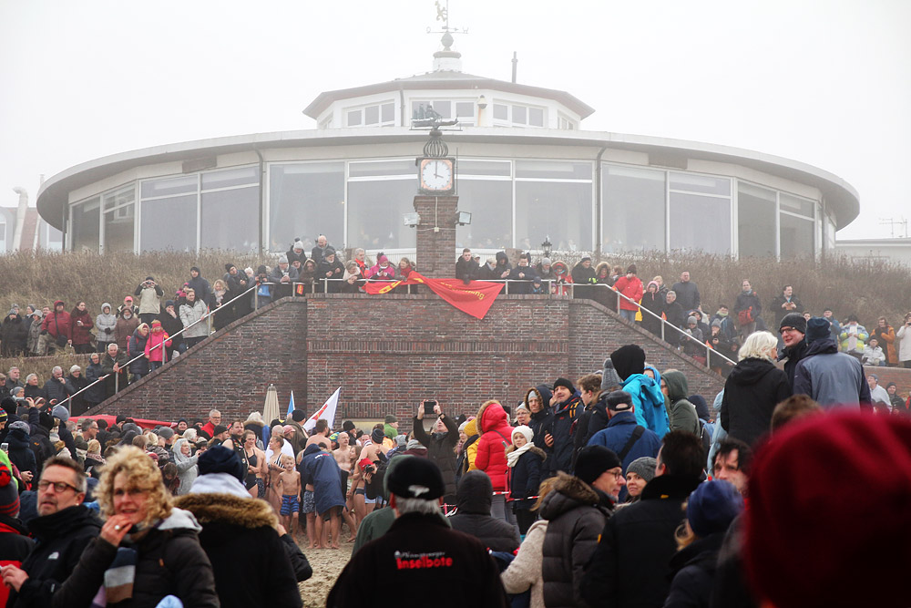 Blick ins Jahr 2018: Unter der Uhr haben sich zahlreiche Menschen versammelt, die sich in wenigen Minuten zum Jahres-Abbaden in die Fluten stürzen werden.