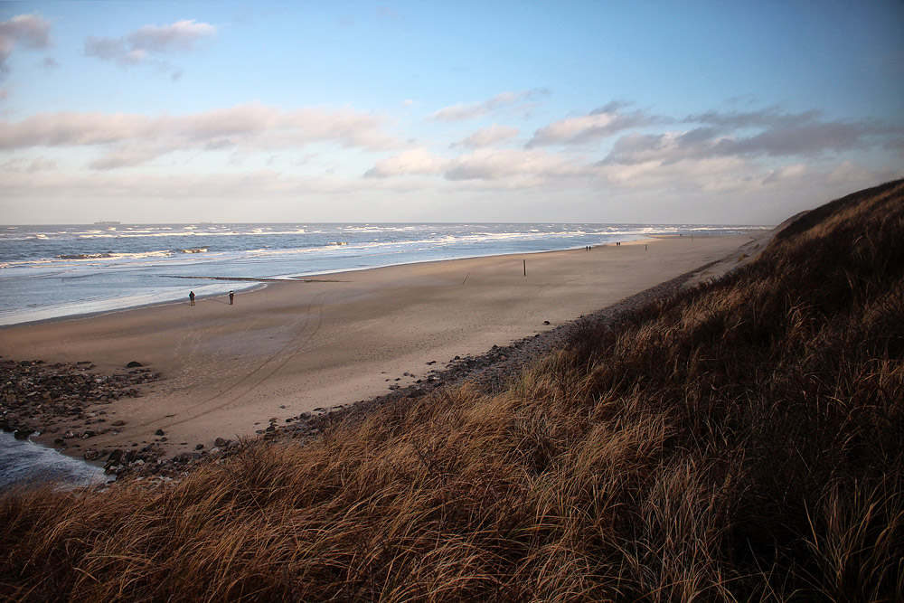 Blick von den Dünen auf den Strandabschnitt zwischen dem Nordwest-Längswerk und dem Surfstrand.