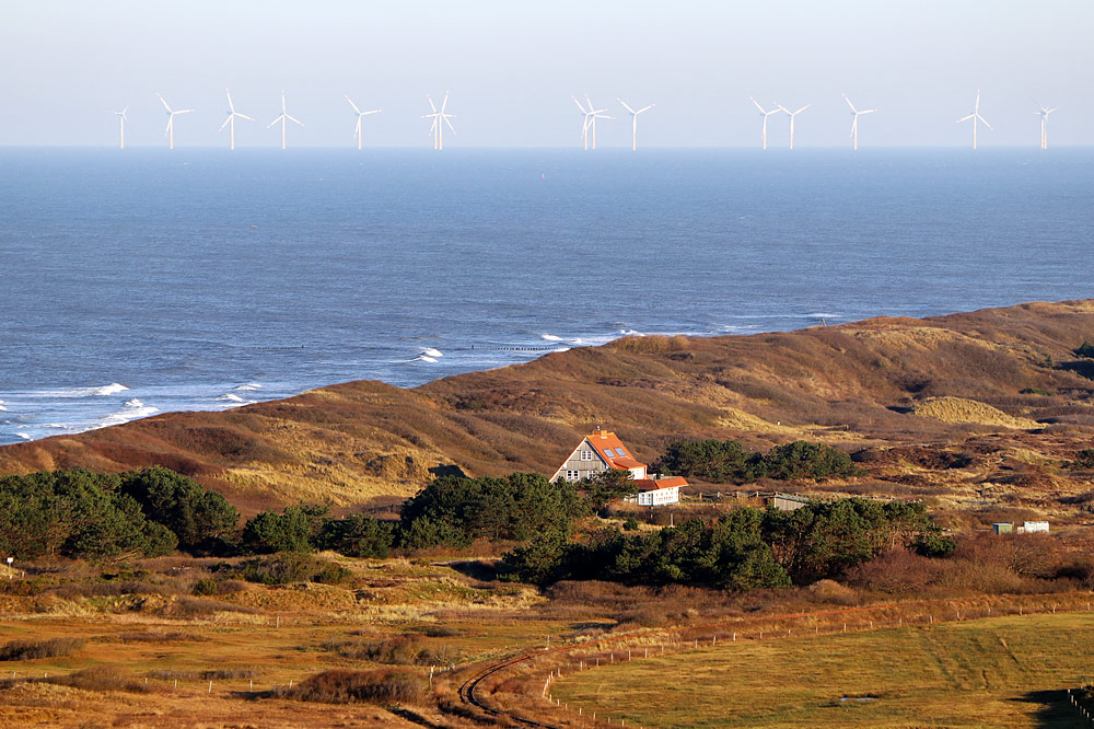 Hier ein Blick zur Saline, die sich auf halber Strecke zwischen dem Dorf und dem Westende im Schatten der Norddünen befindet. Gut erkennt man außerdem im Hintergrund die Windräder des Nearshore-Windparks Nordergründe wenige Kilometer nordöstlich von Wangerooge.