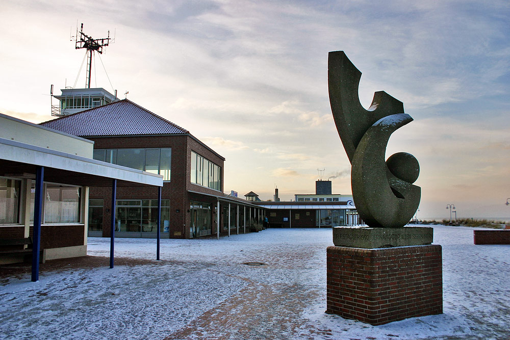 Angekommen am westlichen Ende der Strandpromenade mit dem Platz am Meer und der Skulptur »Der Navigator«.