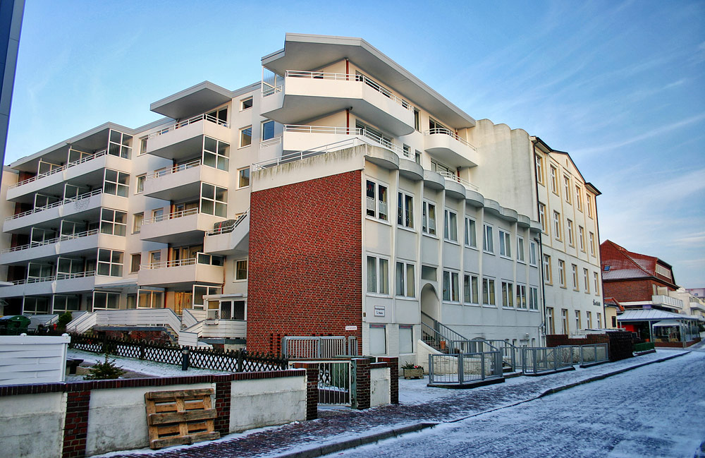 Das riesige Gebäude vor uns trägt zwei Namen: Der südliche Teil, den wir hier sehen, heißt Haus Nautica, während es sich beim nördlichen, zum Meer hin gerichteten Gebäudeteil um das Haus Monopol handelt.
