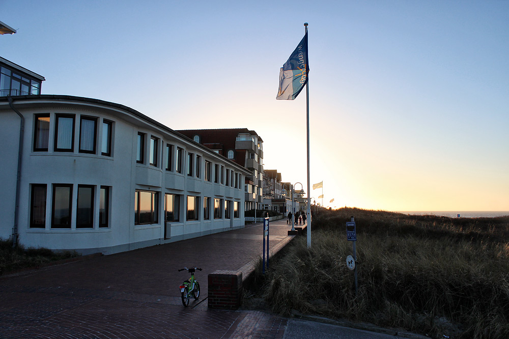 Während auf der Strandpromenade ein besonders großes Gefährt parkt, geht im Hintergrund langsam die Sonne hinter den Häusern Germania und Marina unter.