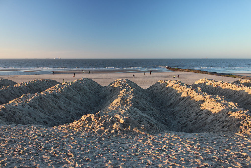 Nach dem Sandauffahren, aber vor dem anschließenden Planieren, gleicht der Hauptstrand einer Hügellandschaft. Nur in Wintern fast ohne schwere Stürme wie dem Winter 2020/'21 kommt man ohne Sandfahr-Maßnahmen aus.