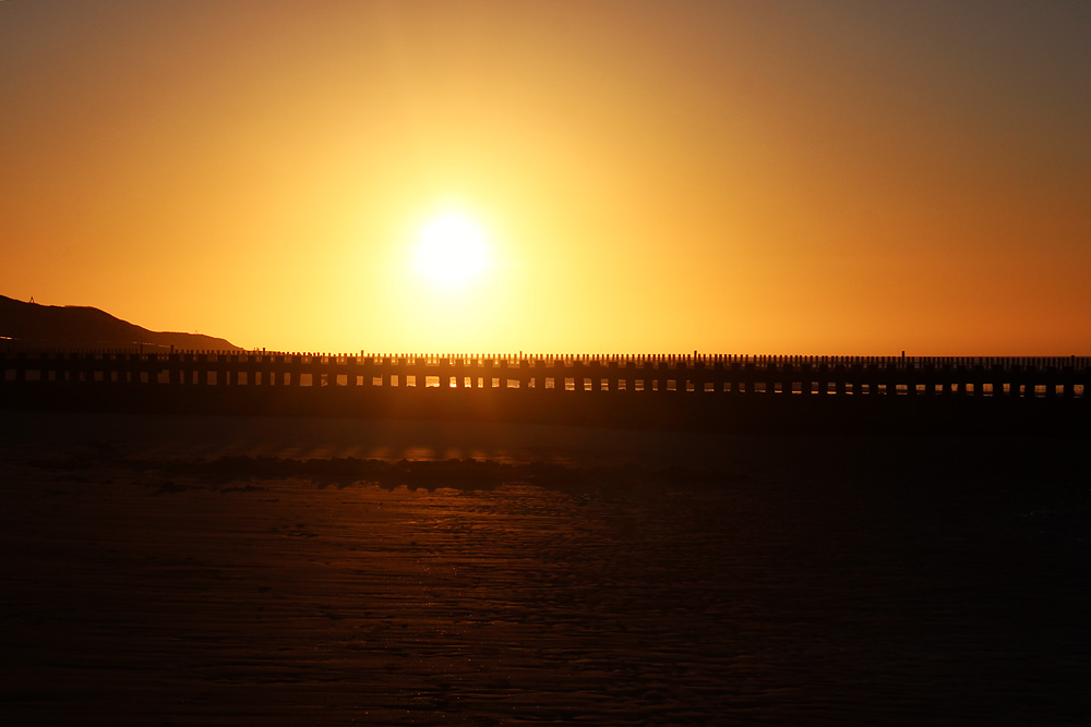Wunderschöner, klarer Frühlingsabend auf Wangerooge: Bei einem Blick vom Hauptstrand aus nach Westen schaut man in die untergehende Sonne, vorbei an einigen Pfahlreihen.