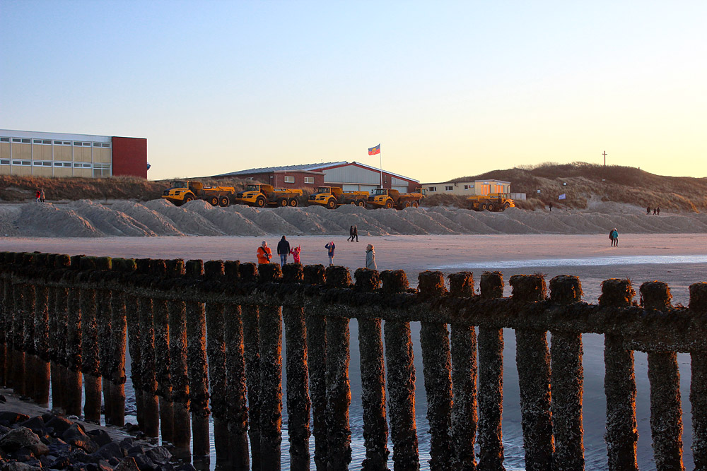 Parallel zur Buhne M wurde, um die Buhne zu unterstützen, eine Pfahlreihe errichtet. Im Hintergrund sehen Sie fünf Dumper, die von der Kurverwaltung für Sandtransporte angemietet wurden.