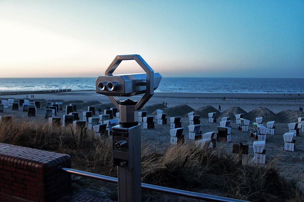 Durch die an der Strandpromenade aufgestellten Ferngläser kann man, Münzeinwurf vorausgesetzt, die Blicke schweifen lassen.