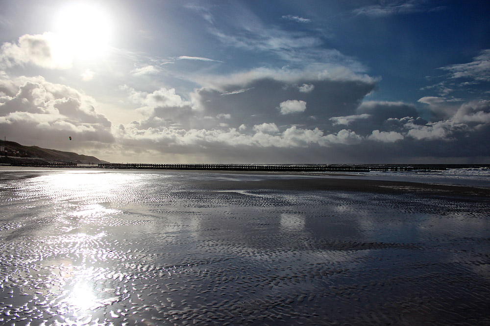 Derzeit ist Niedrigwasser, im Wasser zwischen den Sandrippeln spiegelt sich der Himmel wider.