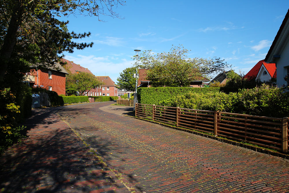 Wir befinden uns hier in der rot geklinkerten Friedrich-August-Straße, die sich mitten im Dorf befindet. Einige Meter weiter kreuzt der Damenpfad, über den man links zum Strand gelangt.