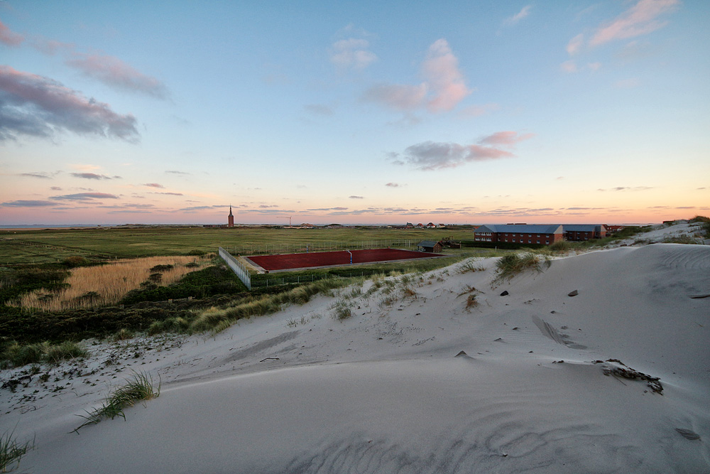Hier ein abendlicher Blick von Norden her auf den Westinnengroden. Vorn der Sportplatz des Bünder Heims, das rechts erkennbar ist, im Hintergrund der Westturm. Rechts daneben wird gerade das Westturm-Café umgebaut, daher steht dort ein Baukran.