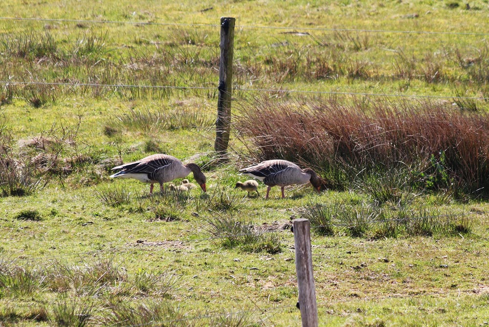 Eine Graugans-Familie grast im Westinnengroden, auch ein paar Küken erkunden die Umgebung.