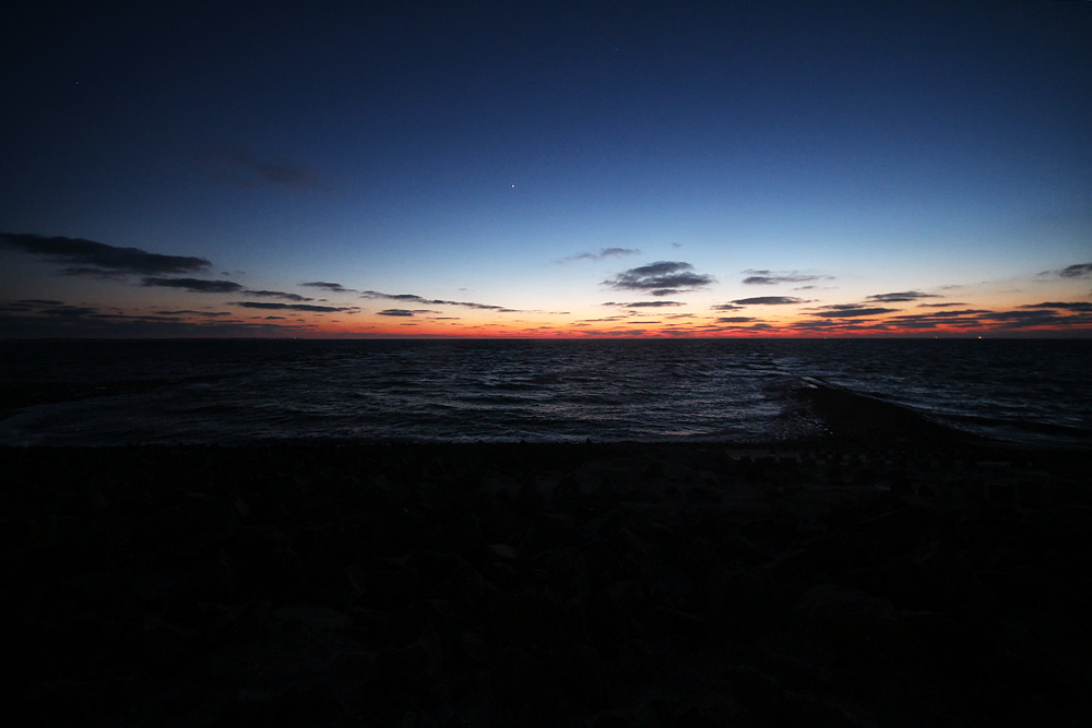 Vor knapp einer Stunde ist die Sonne untergegangen, doch noch immer strahlt der Abendhimmel im Nordwesten. Der Farbverlauf von Rot über Gelb, hin zu Hellblau, Dunkelblau und Schwarz wirkt dabei äußerst harmonisch. Diesen Zeitraum während der Abend- und der Morgendämmerung nennt sich Blaue Stunde.