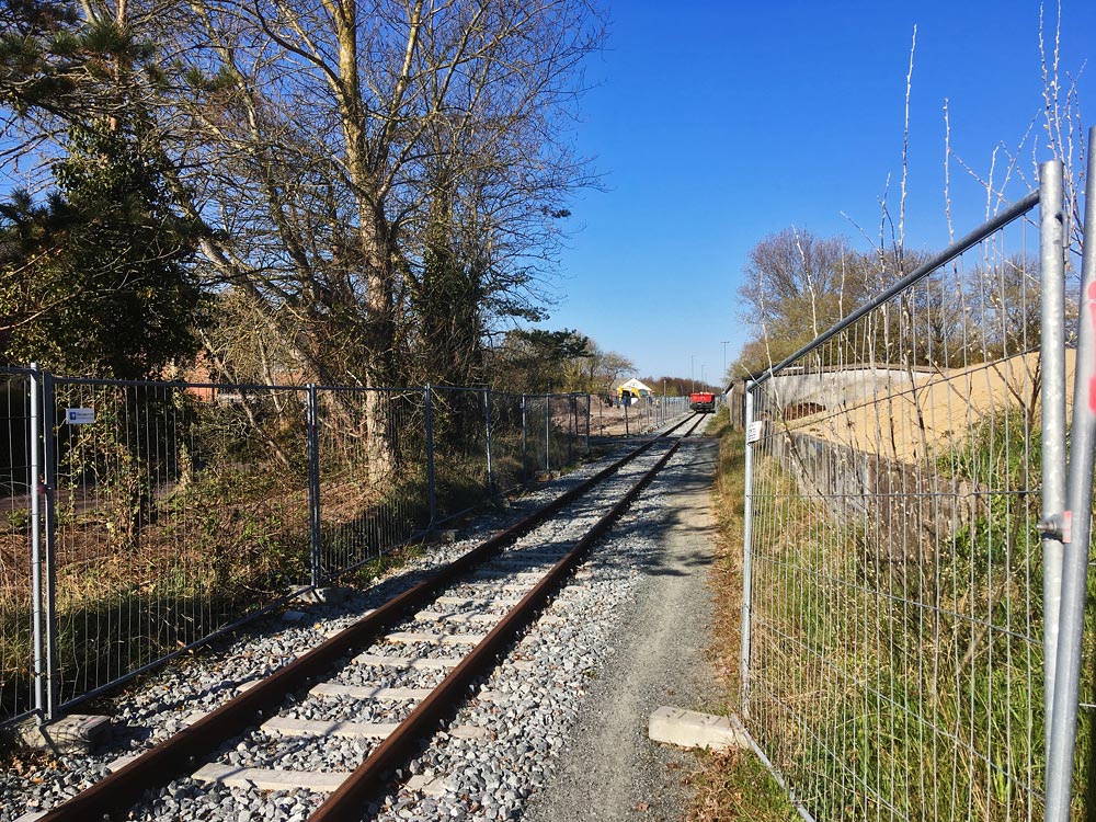 Parallel zur Siedlerstraße verlaufen diese Bahngleise, die aber nur selten genutzt werden. Ganz im Hintergrund sieht man den Lokschuppen sowie einen Flachwagen, der in der Nähe des Bahnübergangs steht.