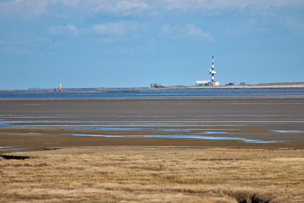 Durchs Teleobjektiv hindurch blicken wir zu unserer östlichen, unbewohnten Nachbarinsel Minsener Oog. Deutlich erkennt man den schwarz-weiß geringelten Radarturm »Minsener Oog Buhne C« sowie einige Arbeits- und Wohnbaracken des Wasser- und Schiffahrtsamtes. Links in der Blauen Balje erkennt man außerdem den Pegel »Wangerooge Ost«, dessen Meßdaten bei der WSV öffentlich abrufbar sind.