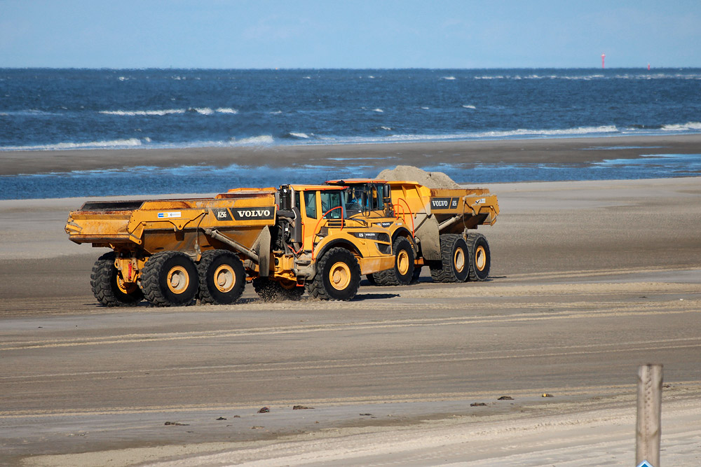 Begegnung von zwei Volvo Muldenkippern am Oststrand: Vorn ein unbeladenes Fahrzeug auf dem Weg zur Ladestelle, dahinter eines, mit dem gerade Sand zum Hauptstrand transportiert wird.