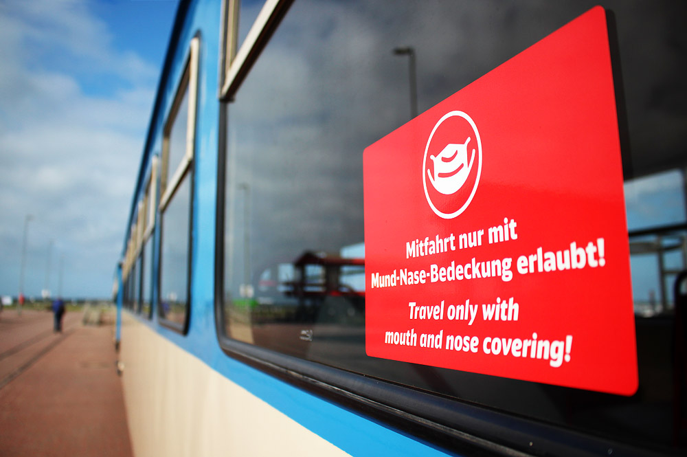 »Mitfahrt nur mit Mund-Nase-Bedeckung erlaubt!«, so lautet der Hinweis an jedem Personenwagen der Inselbahn.
