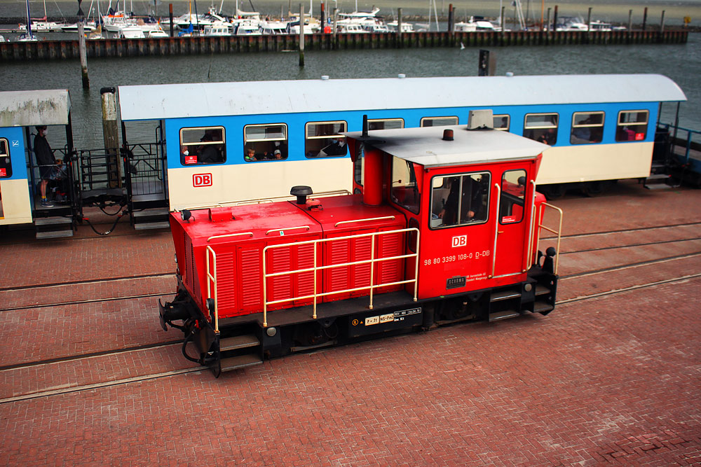 Gerade fährt die 1999 bei Schöma in Diepholz erbaute Lok 399 108-0 auf einem Parallelgleis am Personenzug vorbei.
