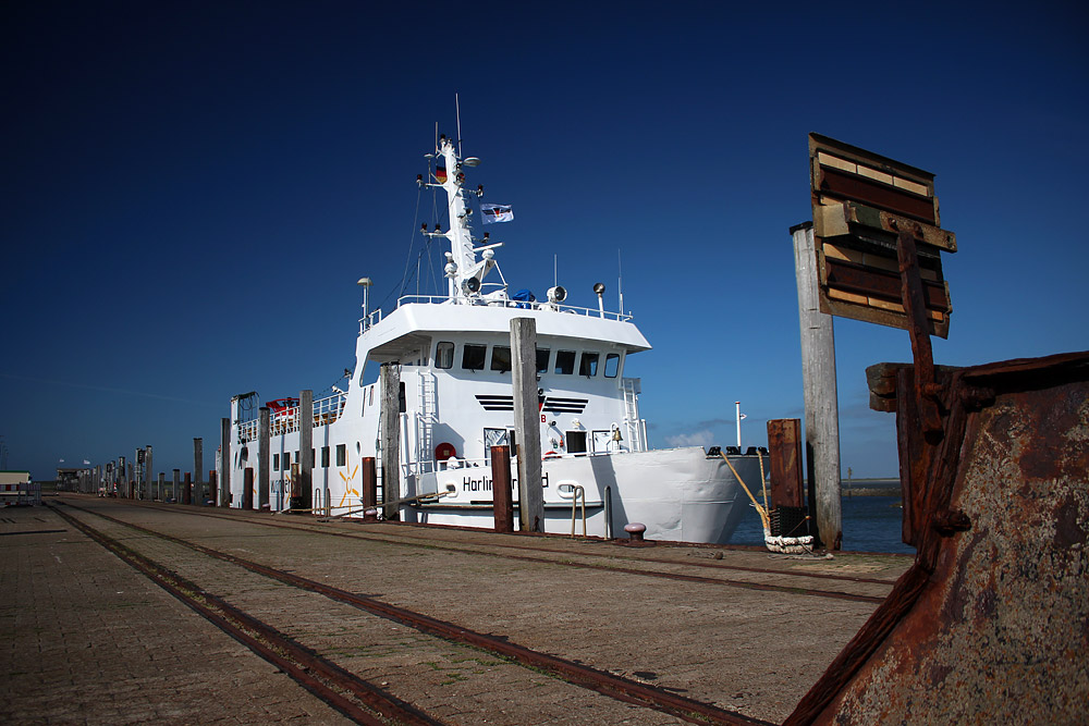 Wir sind bis zum Prellbock gelaufen, von hier aus haben wir nun einen schönen Blick auf den Bug und die Brücke der MS »Harlingerland«. Hierbei handelt es sich um ein Seebäderschiff von 1979, das im Auftrag der Deutschen Bahn zwischen Harlesiel und Wangerooge pendelt.