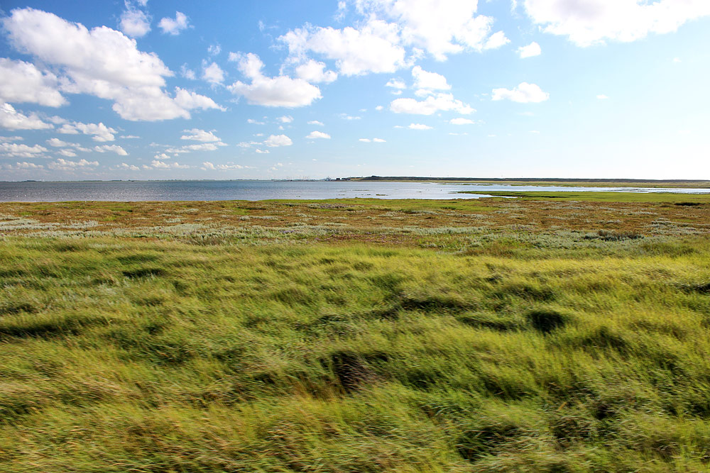In einem weiten Bogen wird die Salinebucht, in der sich einst der Yachthafen befand, umrundet. Bei Hochwasser reicht das Wasser, wie hier im Bild zu sehen, bis an die Salzwiesen heran.