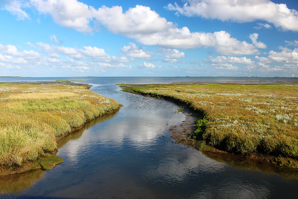 An zahlreichen Stellen werden die Salzwiesen von kleinen und größeren Prielen durchzogen. Hier ein etwas größeres Exemplar, das ein Stückchen weiter östlich ins Wattenmeer mündet.