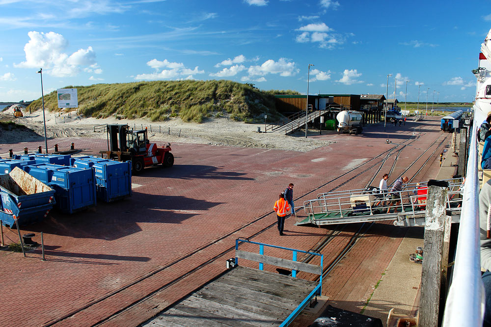 Ein Blick vom Personenschiff »Wangerooge« auf den Westanleger. Soeben gehen die letzten Fahrgäste an Bord.