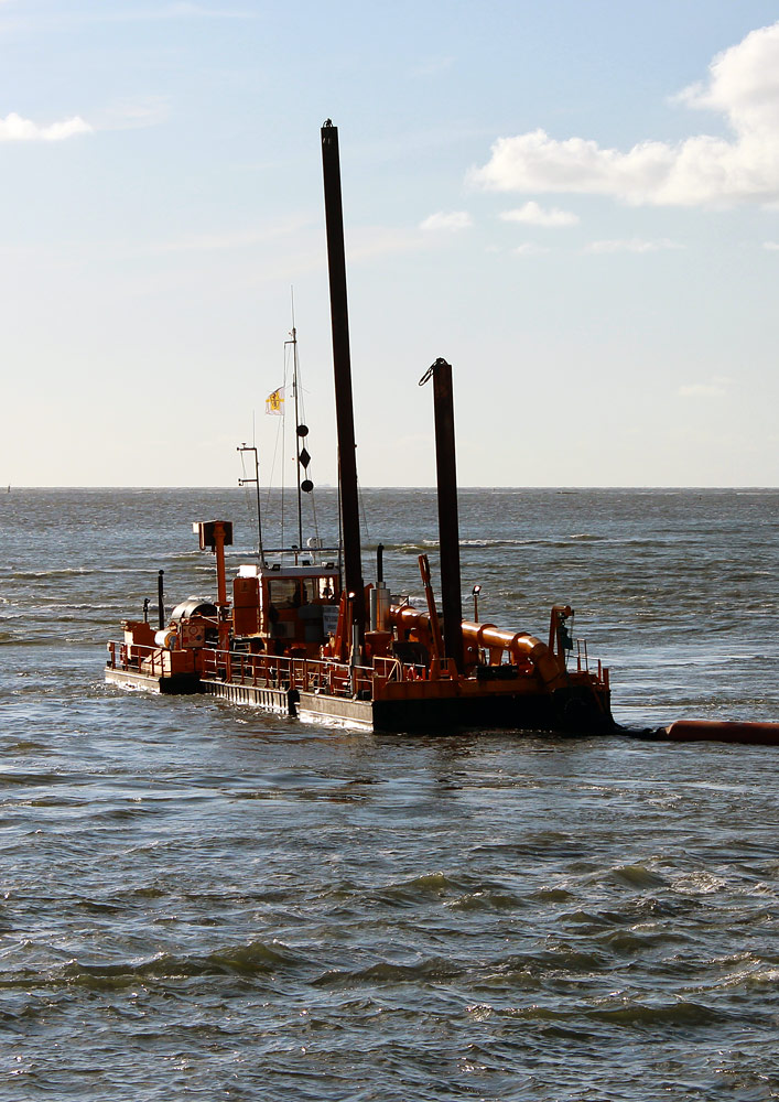 ‹ Hier sehen wir noch einmal den Schneidkopfsaugbagger »Pirat IX« der Johann Bunte Bauunternehmung im Einsatz. Nach rechts hin verläuft die Spülleitung, die am Strand vor den Harle Hörn-Dünen endet.