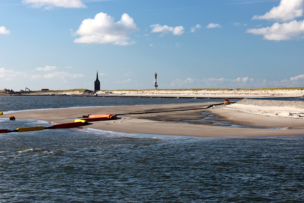 Im Sommer 2017 wurde der Strand vor den Harle Hörn-Dünen aufgespült, um das dortige Strandniveau zu erhöhen. Ganz hinten, in etwa im Bereich des Westturms, sieht man das Spülfeld und weiter rechts ist rostrot das Spülrohr auszumachen. Auch im Vordergrund sieht man die Rohre dieser Leitung, welche hier teilweise mit Schwimmelementen versehen sind.