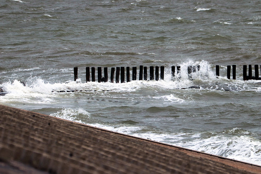 Wellen branden an die Buhne »V«, die sich am Westende von Wangerooge befindet und durch die Pfähle leicht zu identifizieren ist.