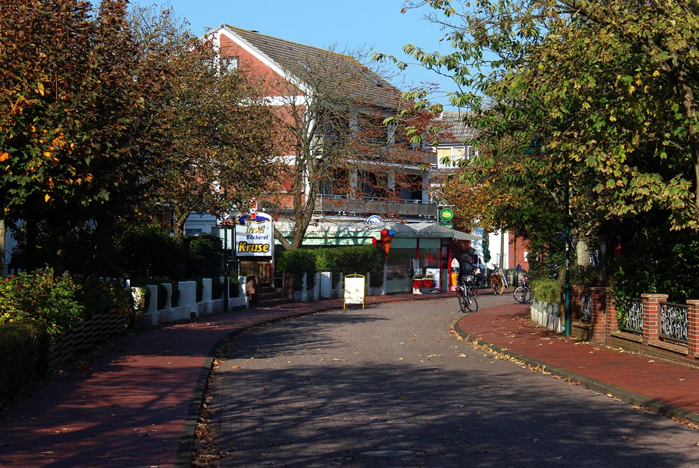 Ein Blick in Richtung Norden. Von der Inselbäckerei Kruse sieht man nur die Werbetafel, umso mehr sieht man von der Terrasse des Restaurants Venezia direkt daneben. Umrahmt wird das Ganze von langsam lichter und bunter werdenden herbstlichen Baumkronen.