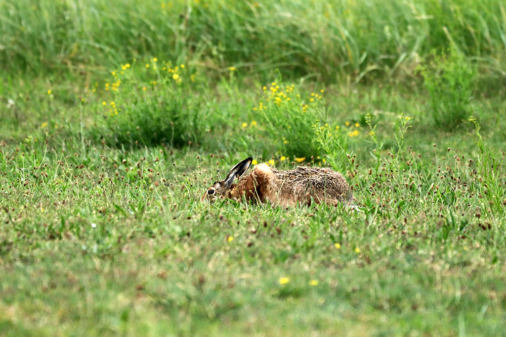 Geduckt knabbert ein Feldhase am saftigen Gras nahe des Deichfußes.