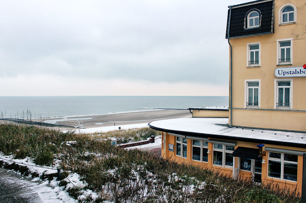Wir stehen hier direkt neben dem Pudding (ja, dort oben gibt es ebenfalls einen Weg) und schauen in Richtung Nordost auf den Strand und das Strandhotel Upstalsboom.