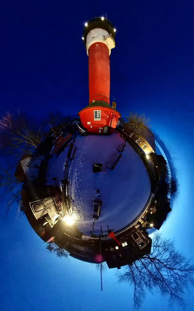 ‹ Dieses abendliche »Little Planet«-Panorama entstand an einem kalten Wintertag zu Füßen des Alten Leuchtturms.