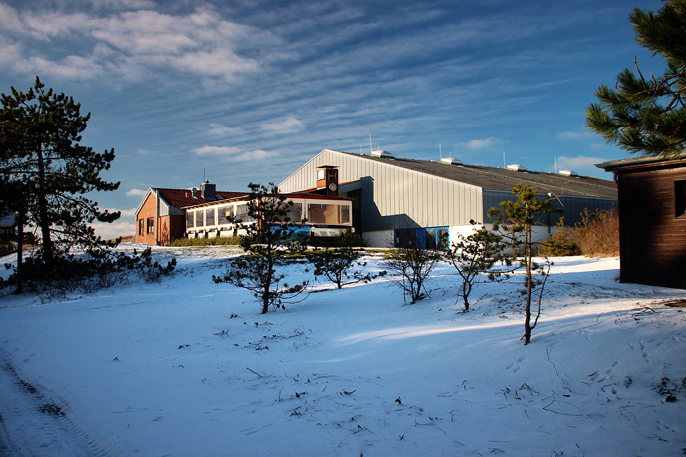 Blick auf die Tennis- bzw. Mehrzweckhalle am Fußweg zum Westen. Der Wintergarten im vorderen Bereich gehört zum griechischen Restaurant Kreta, das immer einen Besuch wert ist.