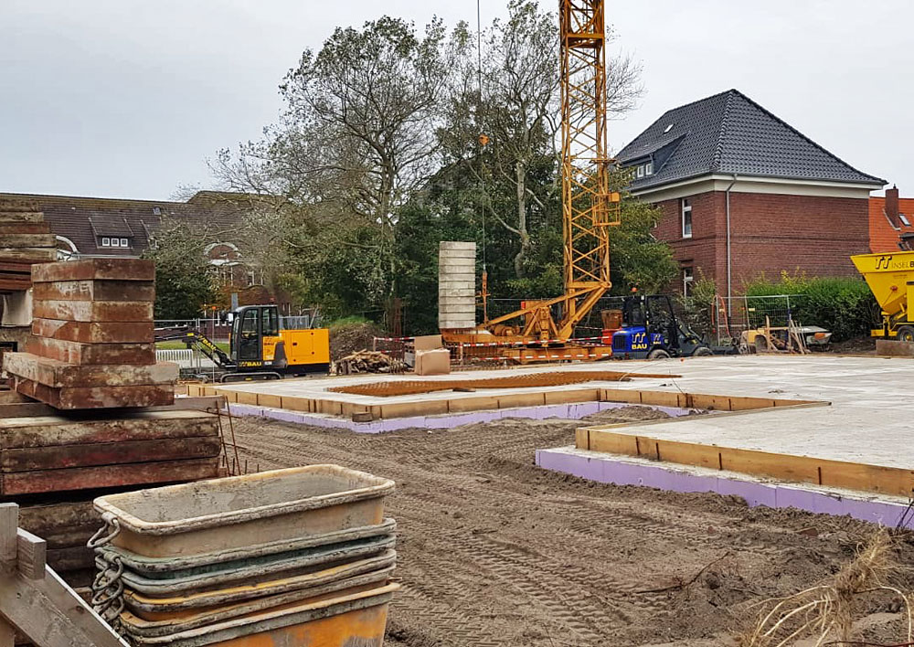 Blick von Süden her auf die Baustelle des neuen Inselkindergartens. Auf diesem Foto erkennt man gut die Nähe zur Inselschule, die in der linken Bildhälfte zu sehen ist.