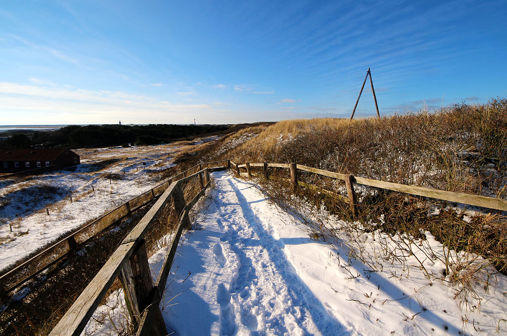 Der Weg die Düne hinauf ist an dieser Überwegung als Serpentine ausgeführt, die Kehre ist in einigen Metern Entfernung zu erkennen.