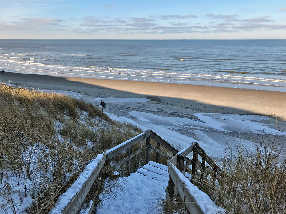Eine steile Treppe führt von den Norddünen hinab zum Strand.