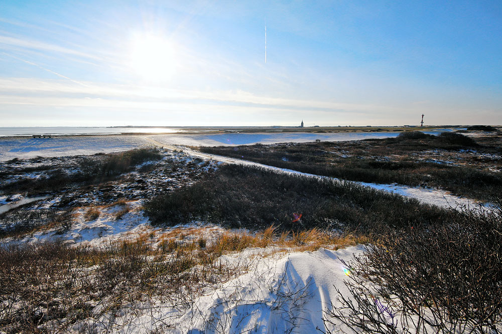 Gegen die Sonne blicken wir zum Süddeich, zur Salinebucht sowie in Richtung Westteil der Insel. Im Hintergrund der Westturm und der Neue Leuchtturm.