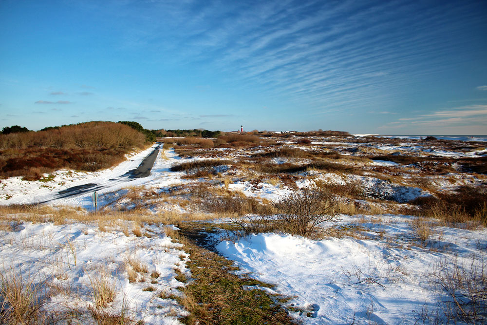 In der linken Bildhälfte erkennt man die Straße zum Westen, die in Richtung Inseldorf führt – aus der Ferne grüßt bereits der Alte Leuchtturm.