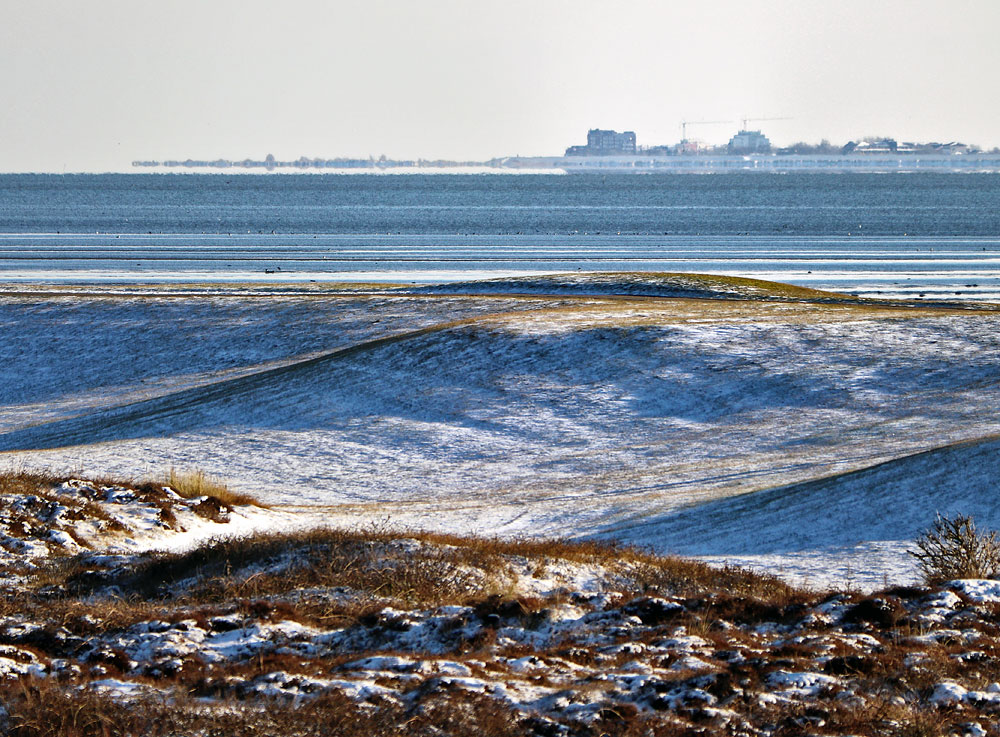 Die nordöstliche Ecke der (ost-)friesischen Halbinsel markiert der Badeort Schillig, den wir hier durchs Teleobjektiv betrachten. Erkennbar ist u. a. das Hotel Upstalsboom als linkes der sichtbaren Gebäude.
