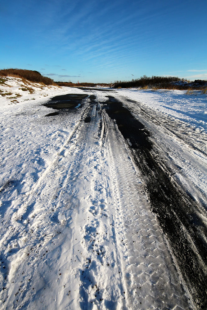 ‹ Die vereiste Straße zum Westen in etwa auf halber Strecke zwischen Neuem Leuchtturm und Inseldorf.