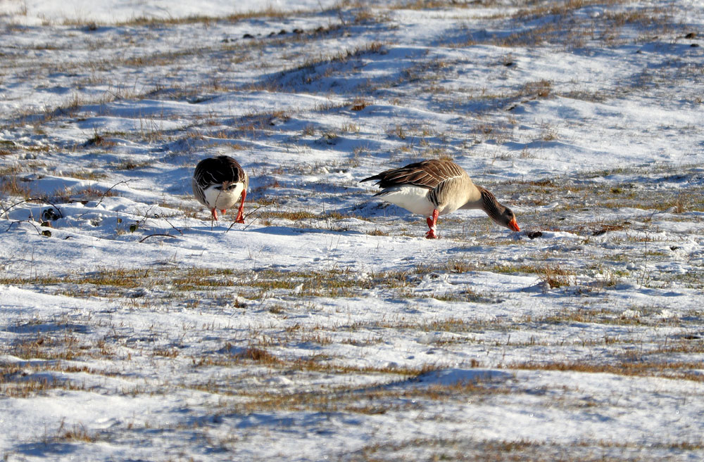 Zwei Graugänse suchen im schneebedeckten Westinnengroden nach Fressbarem.