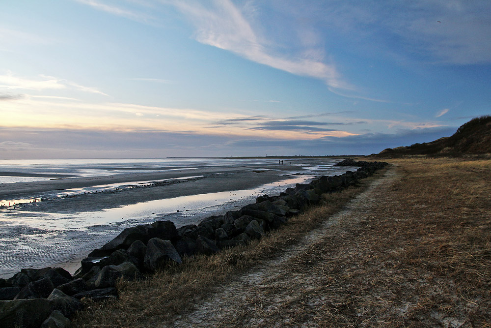 Der Weg zurück in Richtung Dorf führt entlang des Steindamms, welcher bei hohen Wasserständen die Ostdünen schützt.