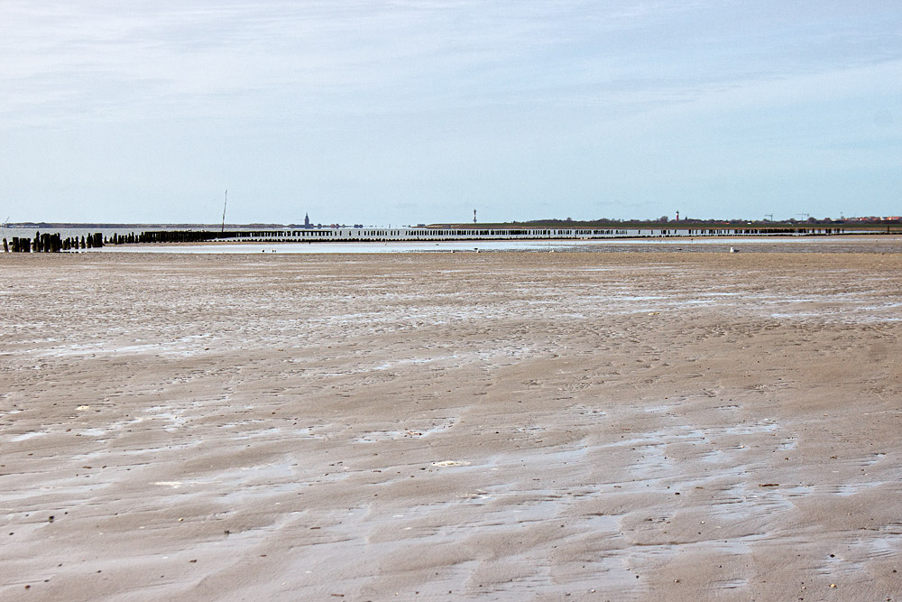 Vom Ostanleger aus schauen wir, nachdem wir bis jetzt immer in Richtung Osten bzw. Süden gelaufen sind, nun wieder in westliche Richtung. Ganz im Hintergrund sind der Westturm, der Neue Leuchtturm sowie der Alte Leuchtturm erkennbar.