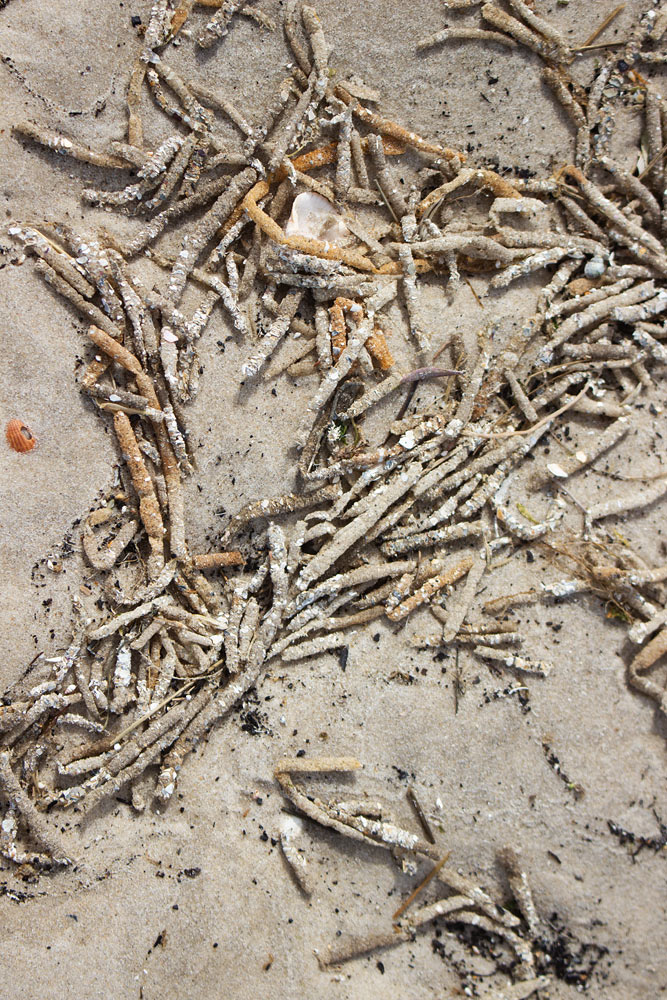 ‹ Vielleicht sind Ihnen diese seltsamen Sandröhren auch schon einmal beim Strandspaziergang aufgefallen. Es handelt sich um verlassene Wohnröhren des Bäumchenröhrenwurms – zeitlebens lebt der Ringelwurm darin. Bis zu 40 Zentimeter können die Röhren lang werden, dabei schauen sie für gewöhnlich etwa zwei Zentimeter aus dem Sand hinaus. Ständige Veränderungen des Meeresbodens spülen oftmals die verlassenen Röhrenhüllen frei, so dass sie, so wie hier zu sehen, auf dem Sandboden liegen.