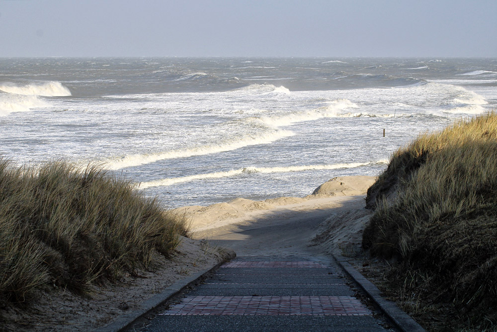 Die Fotografin dieser Aufnahme befindet sich direkt nördlich des Strandhotels Gerken, als diese Aufnahme der tosenden Brandung am Wangerooger Hauptstrand entsteht. Besonders eindrucksvoll erkennt man hier, auf welch schmales Maß der Bade- und Burgenstrand zusammengeschrumpft ist.