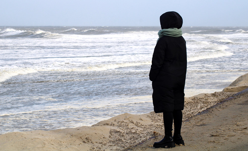 Das Naturschauspiel der Mittags-Sturmflut wollten sich viele, die Mitte Februar auf der Insel weilten, nicht entgehen lassen – so auch diese Dame, die von der Strandmauer aus die tosende Nordsee beobachtet.