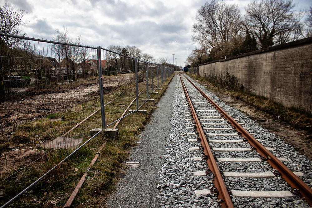 Zwischen Schuppen und Baracken (rechts) und einem Bauzaun (links) verlaufen die erst kurz zuvor grundlegend erneuerten Gleise der Inselbahn. Das Bahngelände entlang der Siedlerstraße wurde kürzlich geräumt und die alten Schuppen wurden dem Erdboden gleich gemacht.