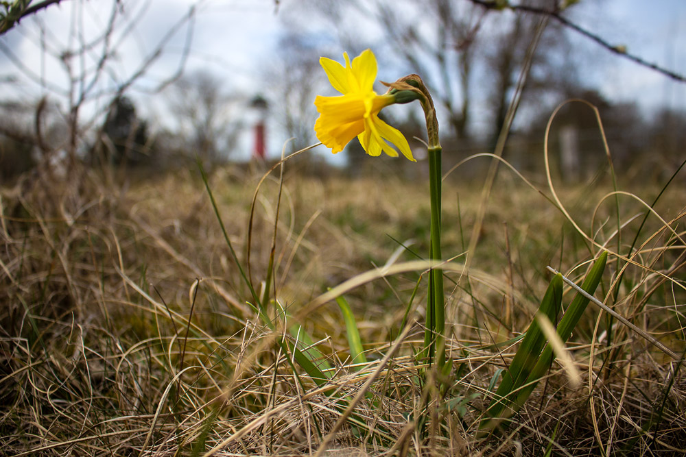 Insulares Narzissenmotiv mit dem Alten Leuchtturm im Hintergrund.