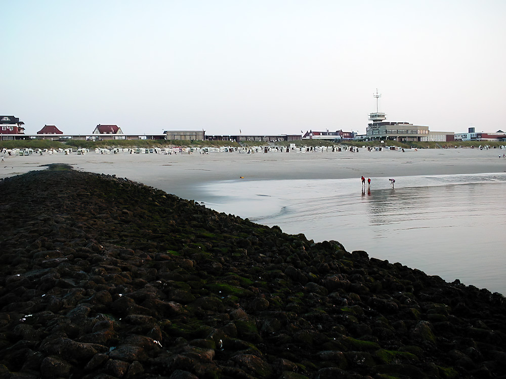 Nachdem wir uns etwas weiter im Uhrzeigersinn gedreht haben, blicken wir nun in Richtung Gemeinde- und Kurverwaltung, Signalstation und Kurhaus Graf Luckner. Während sich die Bebauung im östlichen Bereich der Strandpromenade nur in Details verändert hat, sieht hier mittlerweile alles komplett anders aus: Anstatt des Wandelgangs und des Cobigolf-Platzes steht an der Promenade nun das Aparthotel Anna-Düne und rechts, wo Kurhaus und Großer Kursaal zu sehen sind, befindet sich nun der Platz am Meer.