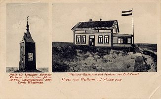 Im Jahre 1602 wurde der Westturm als eine weithin sichtbare Landmarke auf Wangerooge fertiggestellt. Doch schon im Mai 1612 reichte Graf Anton Günther bei seinem Aufenthalt zur Kaiserwahl in Frankfurt a. M. einen Gesuch betreffend des Weserzolls ein, der in Art. 11 besagte, daß der Graf schon desöfteren »von vielen vornehmen Kaufleuten ersucht worden« sei, auf dem Turm eine »immer brennende Leuchte zu halten«, wonach man sich nachts beim Navigieren richten kann.